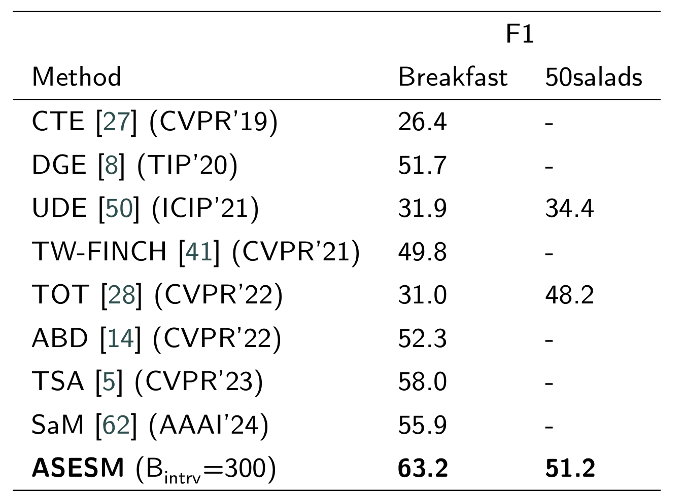 表3:无监督检测-校正算法与现有的无监督方法在50Salads和breakfast数据集上的对比
