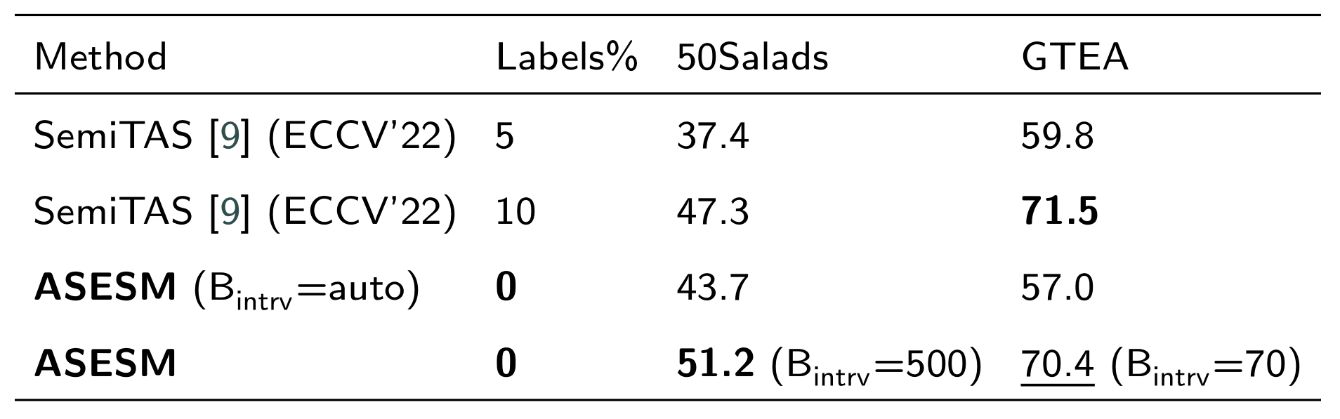 结论:当半监督模型使用5%标签数据训练时,无监督模型明显领先;当半监督模型使用10%标签数据训练时,无监督在50Salads上ASESM效果更好,在GTEA数据集效果略差