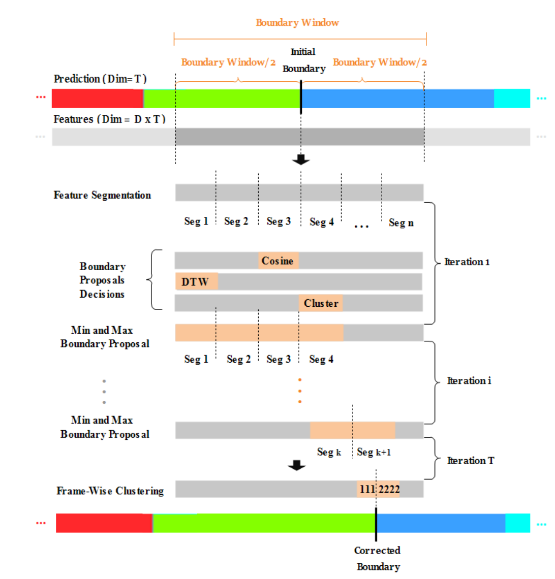 基于使用聚类、余弦和 DTW 进行相似性度量的相同思想,我们提出了一种非监督边界检测-校正算法,该算法在没有任何初始粗略预测的情况下运行。