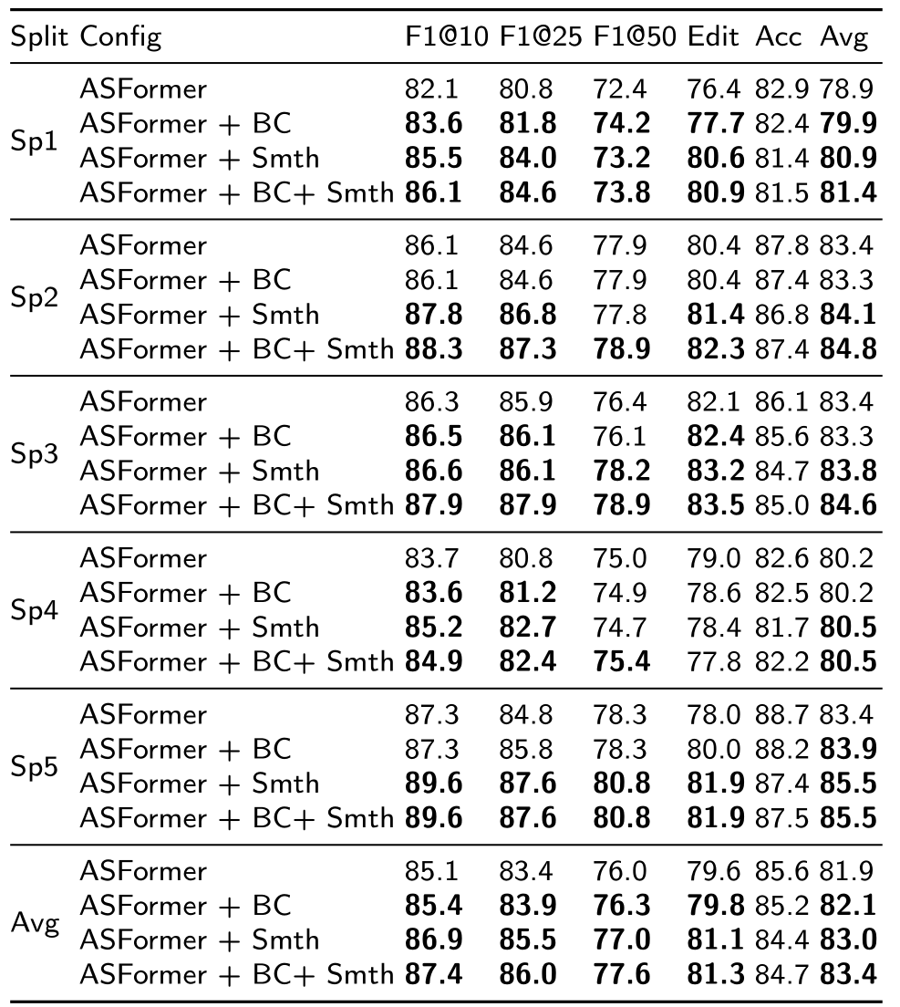 表2:监督学习方法使用边界优化和平滑作为后处理对ASFormer模型的提升,数据集是50Salads的不同split