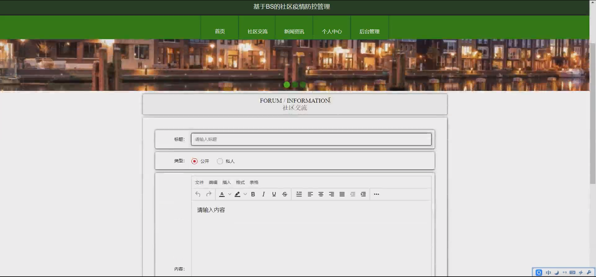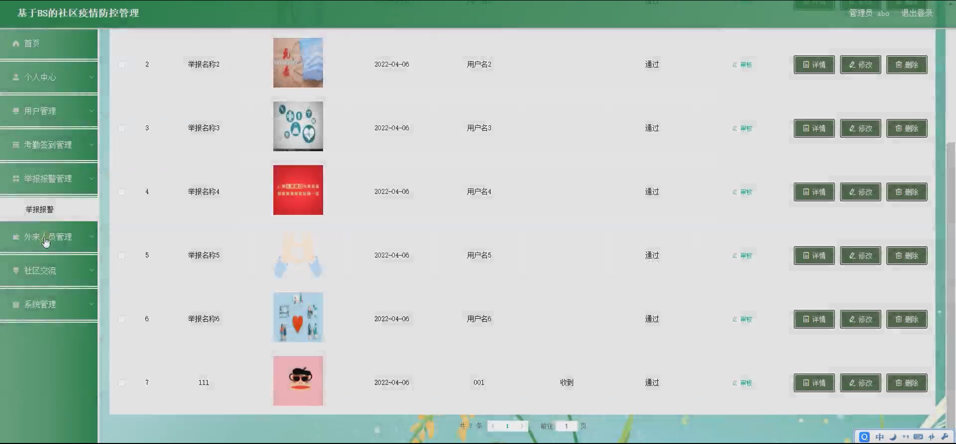 功能模块:住户管理、疫情报备、举报报警、外来人员管理、外出申请及系统管理(用户登录、权限管理、数据备份等);