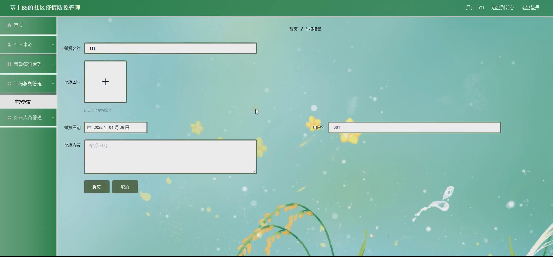 系统项目功能:住户,疫情报备,举报报警,外来人员,外出申请