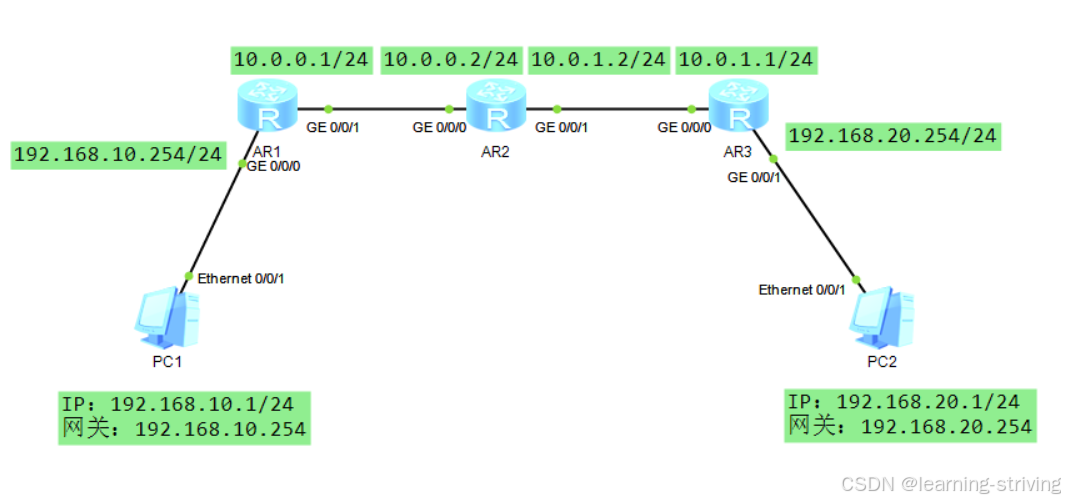 # 目的网络:PC2所在网段(192.168.20.0/24),下一跳:AR2的GE0/0/0接口(10.0.0.2)