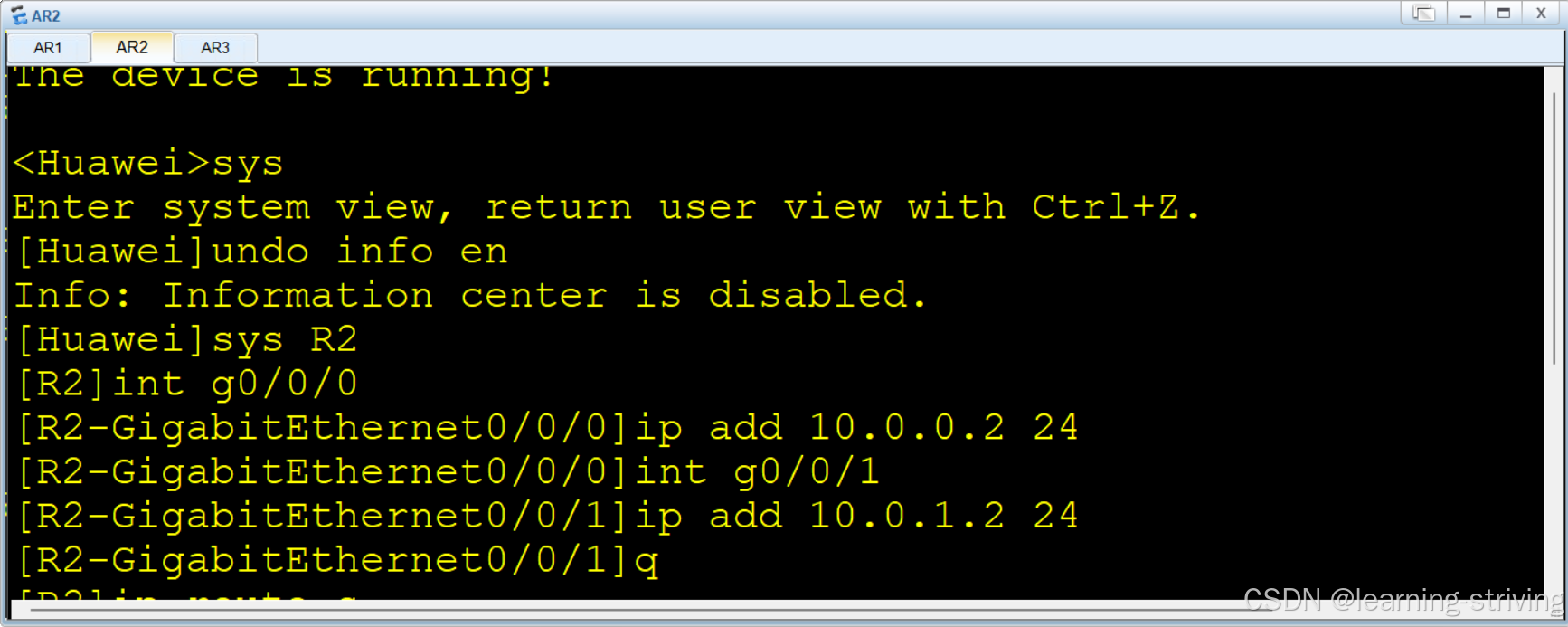 [AR2-GigabitEthernet0/0/0] ip address 10.0.0.2 24