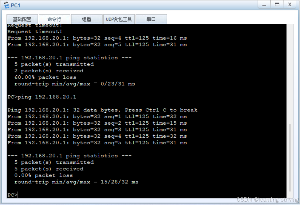 # 在PC1命令行中 PC1> ping 192.168.20.1成功输出示例: