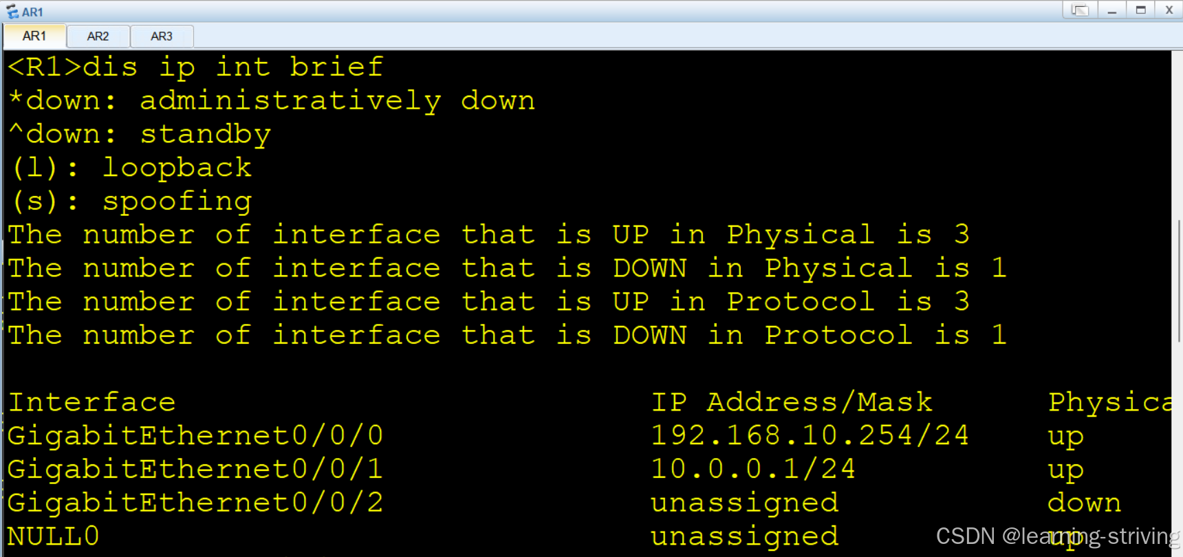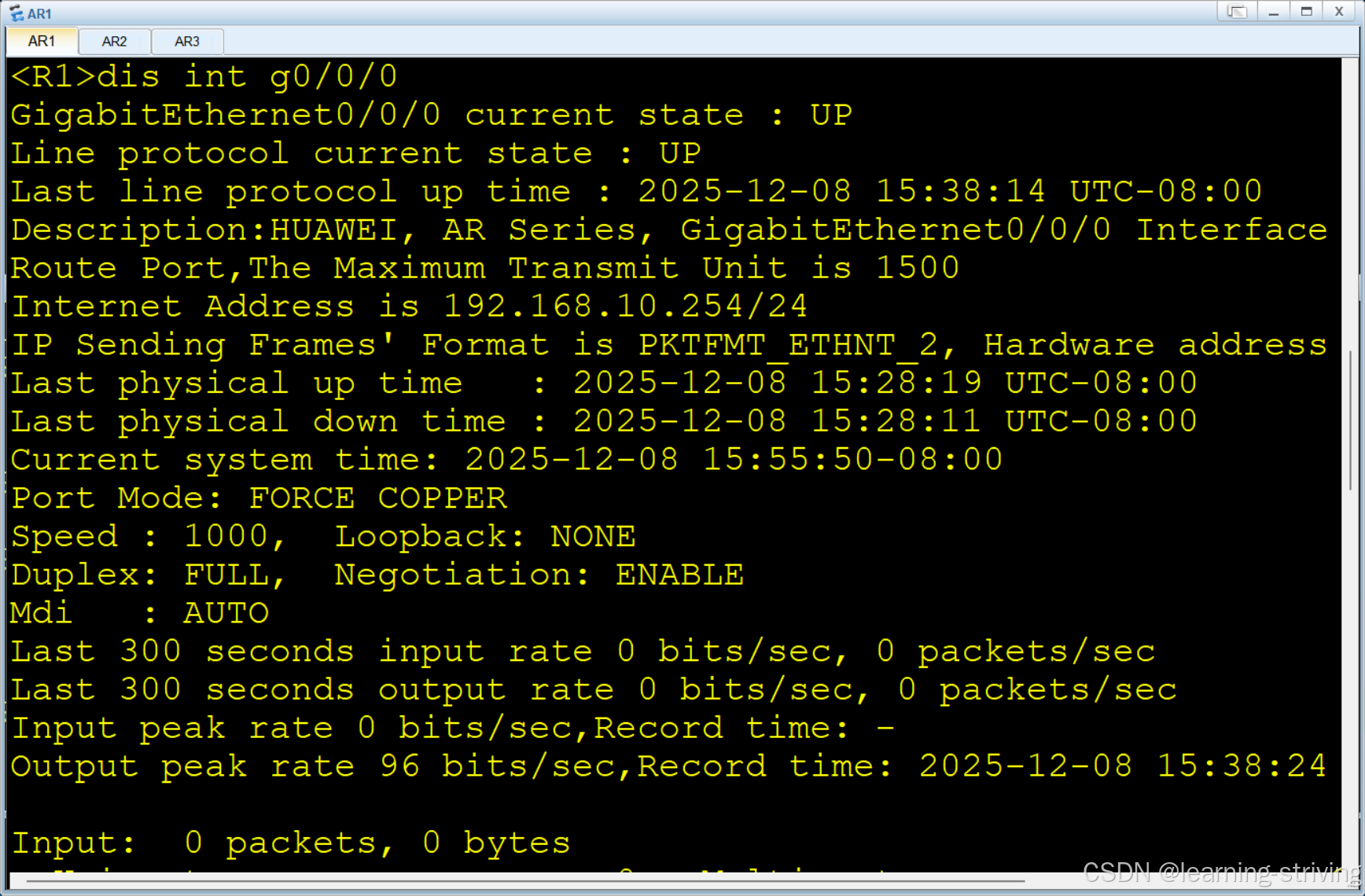 <AR1> display interface GigabitEthernet 0/0/0 # 查看具体接口状态