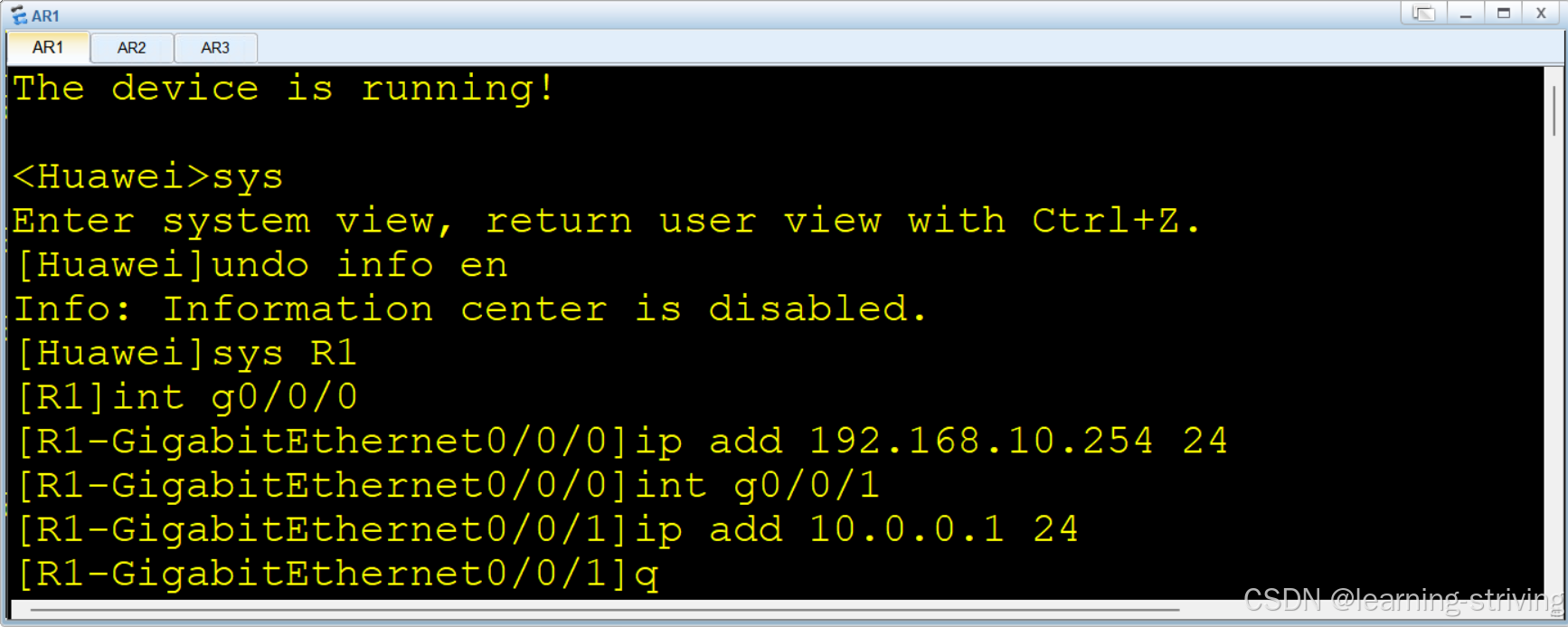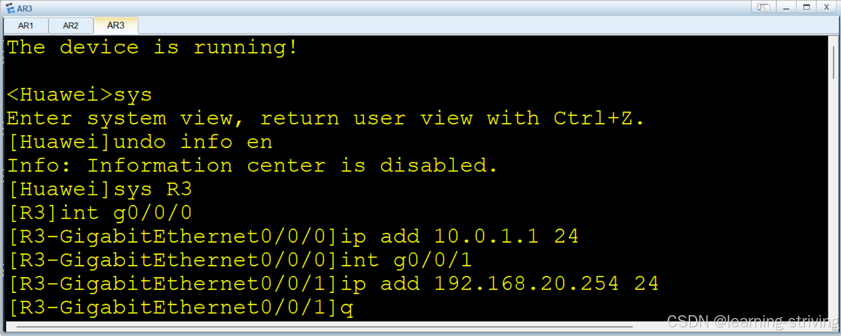 [AR3-GigabitEthernet0/0/0] ip address 10.0.1.1 24