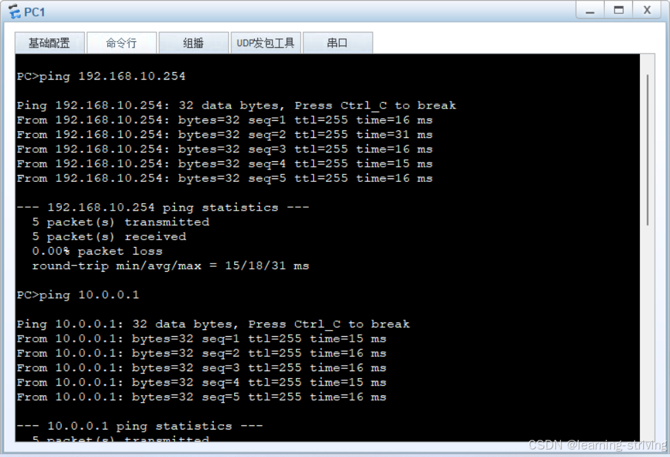 # 在PC1上测试 PC> ping 192.168.10.254 # ping AR1,应通 PC> ping 10.0.0.1 # ping AR1的另一个接口,应通 PC> ping 192.168.20.1 # ping PC2,应通(配置静态路由后) -