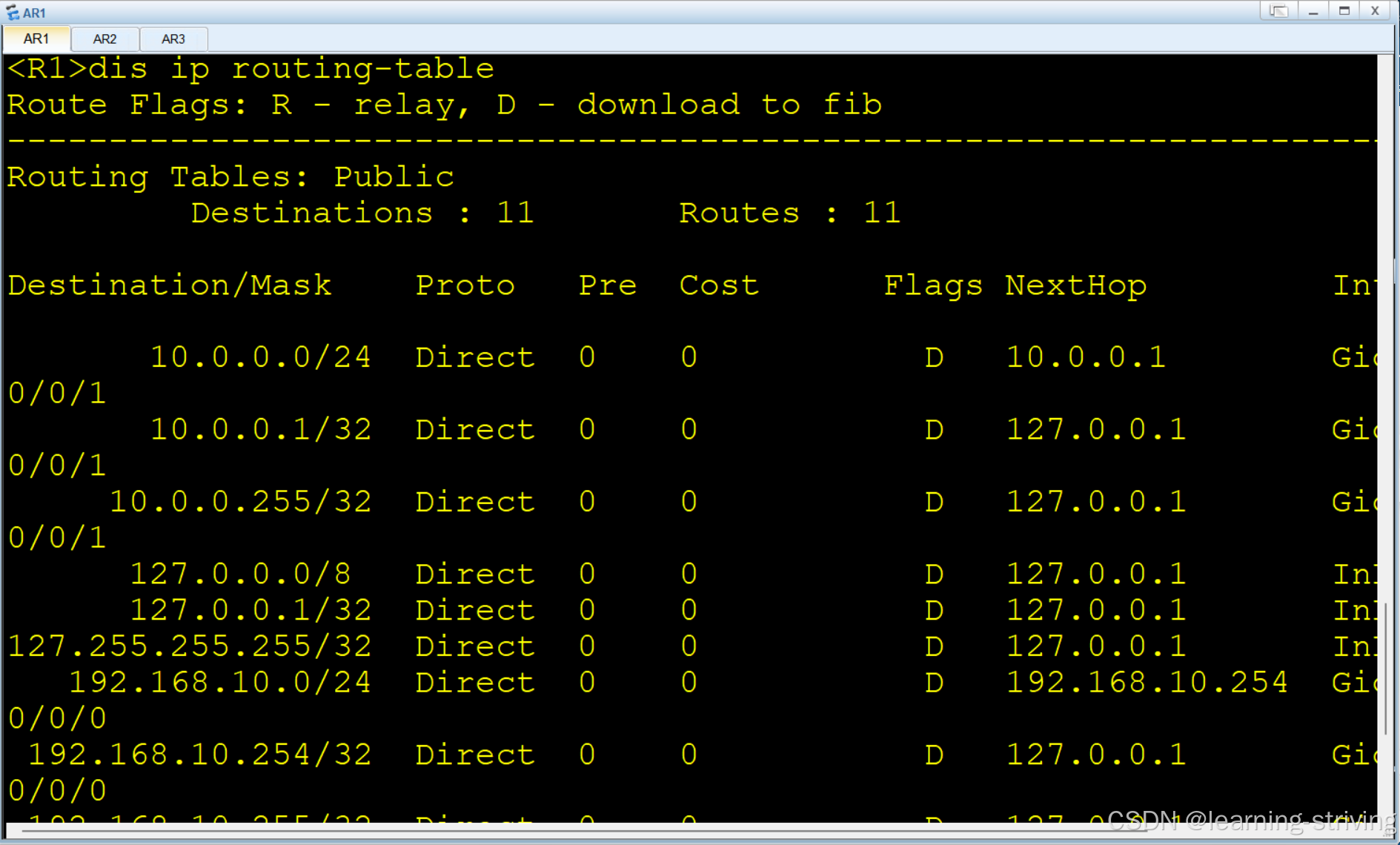 <AR1> display ip routing-table # 查看路由表