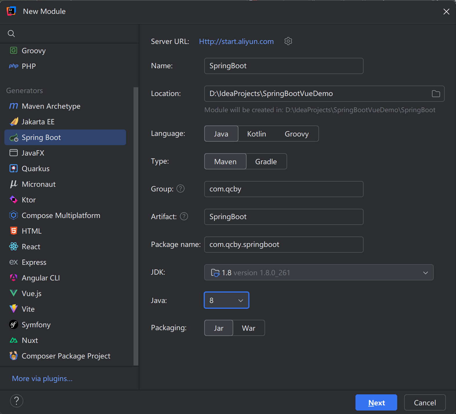 这里我们可以创建Maven项目自己改成SpringBoot项目,也可以直接创建SpringBoot项目。