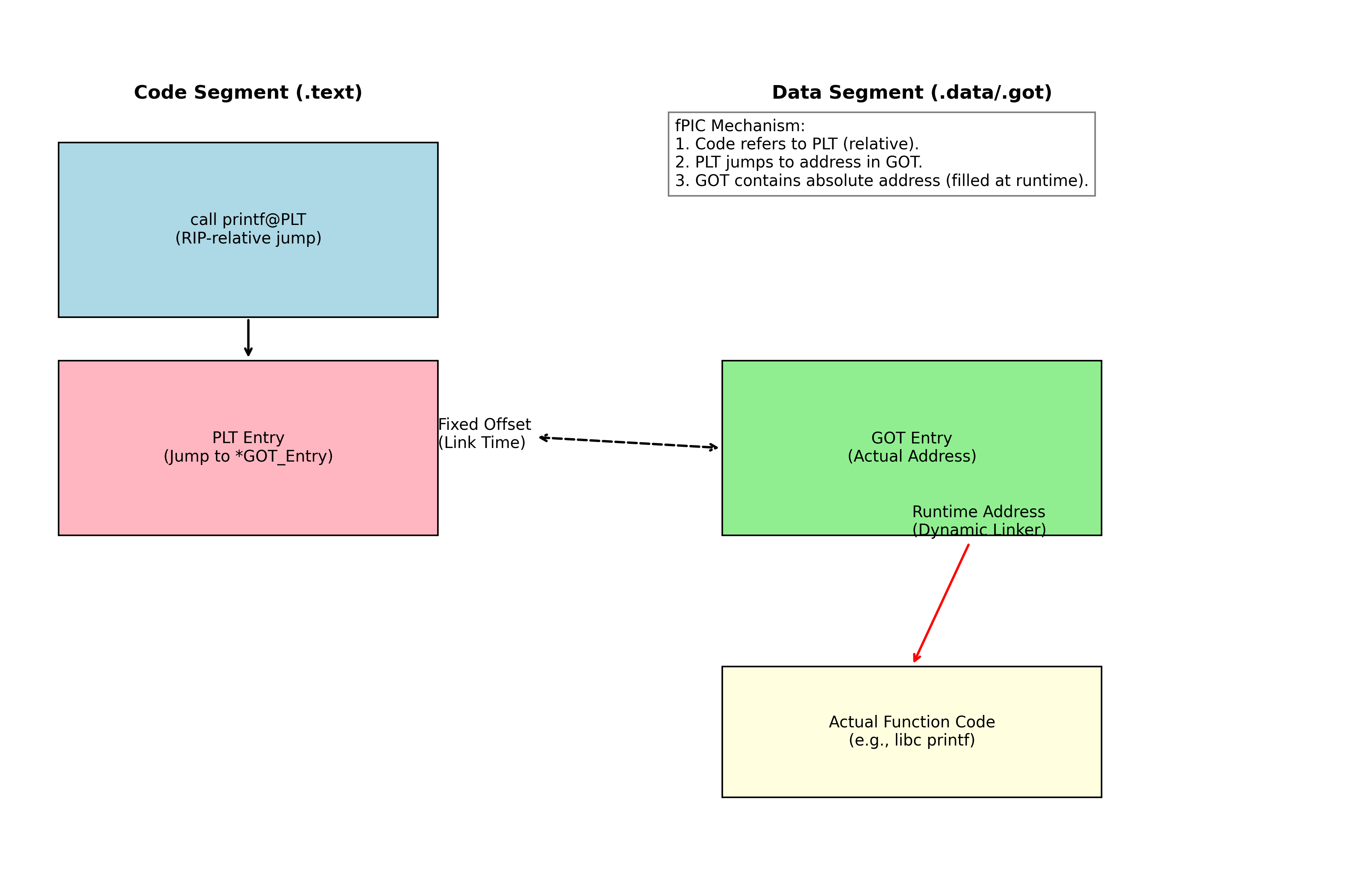 - 过程: 代码段访问 GOT 中的条目,动态链接器在加载时填入变量的真实绝对地址。