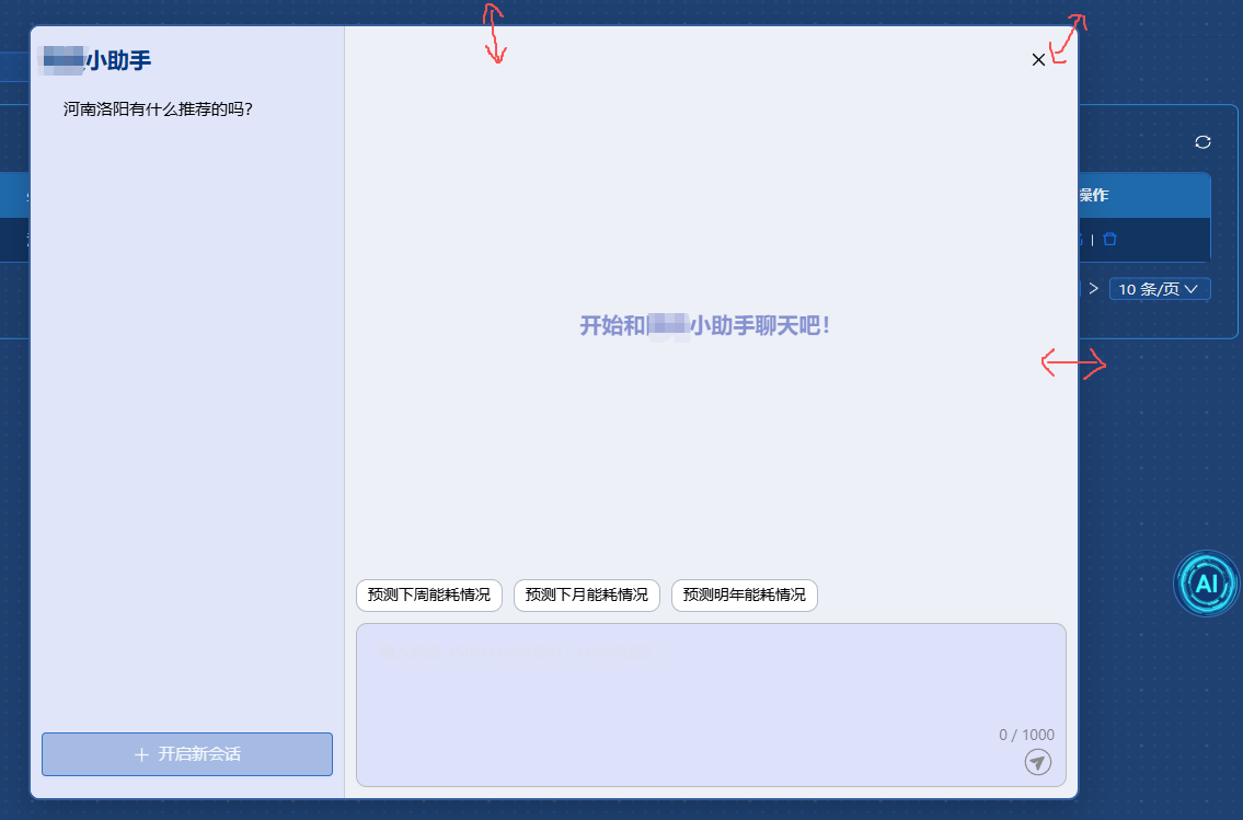 前端实现功能:全局图标点击和拖拽吸附侧边功能。点击图标弹出对话框,对话框支持自由拖拽和调节大小。对话框中实现基础问答,复制答案,会话整理等。