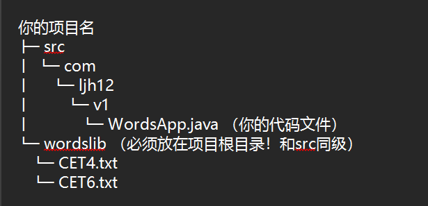 - 检查代码中路径字符串 wordslib/CET4.txt 的拼写,和文件夹、文件名完全一致;