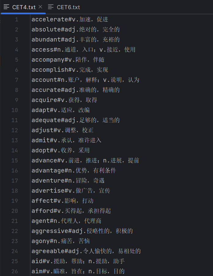 2. 新建 CET4.txt 和 CET6.txt,按"英文#中文"格式写单词(示例):