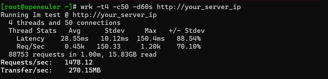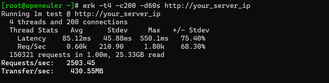 通过上述评测,我们收集到了 openEuler 在默认配置下处理 Web 请求的直观性能数据。