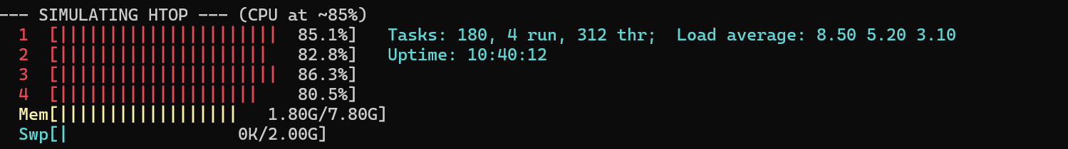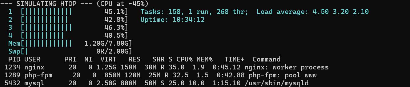 在一个终端窗口中运行 htop 进行实时监控,在另一个终端窗口中执行 wrk 命令。
