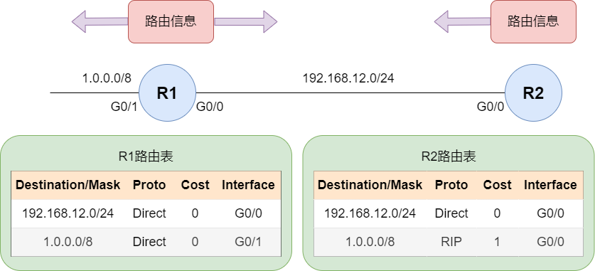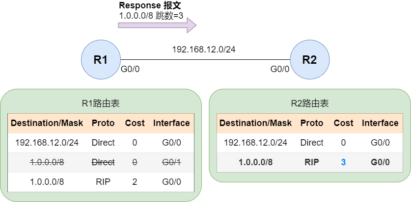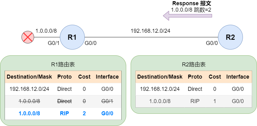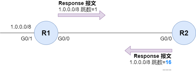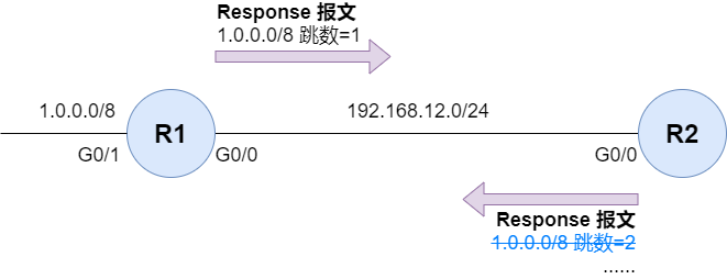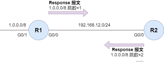 R1 和 R2 都运行了 RIP ,当网络收敛后,R2 通过 RIP 学习到了 1.0.0.0/8 路由。现在 R1 的 G0/1 接口发生故障,R1 感知到这个拓扑变化,并立刻删除 1.0.0.0/8 路由。然而 R2 并不知道这个拓扑变化,R1 准备在下一个更新周期进行通告。这时就会出现一种可能,R1 在更新之前,R2 的更新周期到了,从 G0/0 接口发生 Response 报文,报文包含 1.0.0.0/8 路由,且跳数为 2 。R1 收到这个 Response 报文后,发现 1.0.0.0/8 可以通过 R2 到达,且跳数为 2 ,于是 R1 将 1.0.0.0/8 路由添加到路由表中。