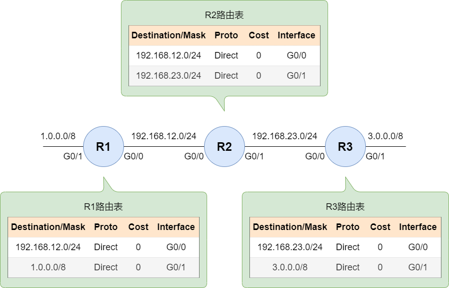 R3 也会收到 R2 的路由更新,R2 也会收到 R1 和 R3 发送的路由更新。经过第一轮的路由通告和学习,R1 学习到 192.168.23.0/24 的路由,R2 学习到 1.0.0.0/8 和 3.0.0.0/8 两条路由,R3 学习到 192.168.12.0/24 的路由。
