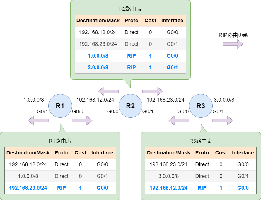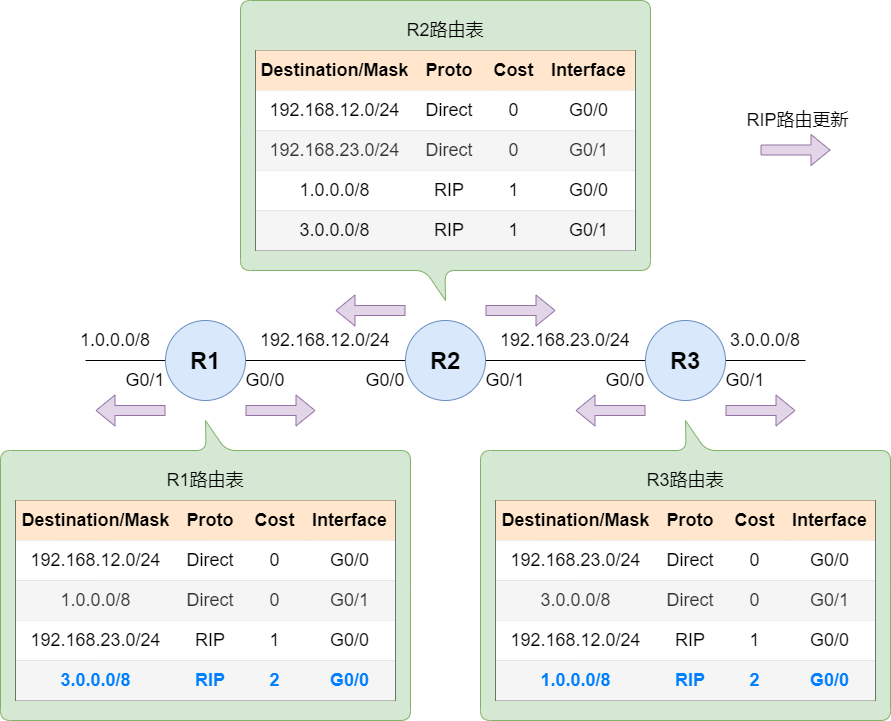 来到下一个更新周期时,所有路由器又会把自己的路由发送出去。R1 收到 R2 通告的路由,发现 3.0.0.0/8 不在路由表中,R1 就把这条路由添加到路由表,度量值为 2 跳,表示 R1 到达 3.0.0.0/8 需要经过两个路由器。另一边的 R3 也从 R2 学到了 1.0.0.0/8 的路由。这样三台路由器就有了全网各个网段的路由,路由表也稳定下来,这个状态说明网络中的路由已经完成了收敛。网络收敛后,路由器还是会周期性的通告路由,确保路由的有效性。