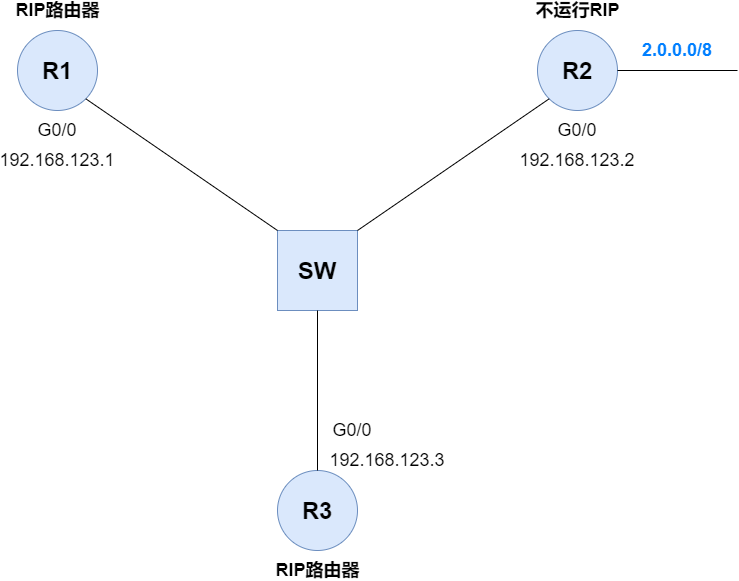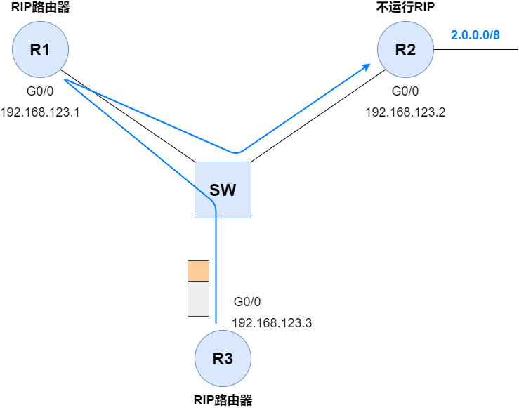 RIPv2 增加下一跳字段解决这个问题,当 R1 将 2.0.0.0/8 路由通过 RIP 通告给 R3 时,Response 报文会携带下一跳字段,值为 R1 到达目的网段的直连下一跳地址,也就是直连网段中的 192.168.123.2( R2 的接口地址)。R3 收到 Response 报文后,将路由 2.0.0.0/8 添加到路由表,下一跳设置为 192.168.123.2(这个地址直连可达)。R3 去往 2.0.0.0/8 的数据包会直接转发给 R2 ,而不会经过 R1 去转发。
