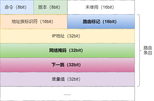 命令( Command ):表示 RIP 报文类型。值为 1 时表示 Request 报文,向直连路由器请求全部或部分路由信息。值为 2 时表示 Response 报文,用于发送路由更新。可以是 Request 报文的回应,也可以是路由器主动发送的。一个 Response 报文最多携带 25 个路由条目,当路由数量超过 25 时,会使用多个 Response 报文发送。