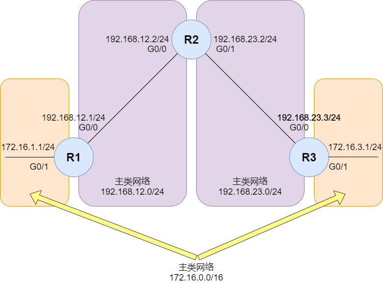 R1 连接着 172.16.1.0/24 ,R3 连接着 172.168.3.0/24 ,这时 172.16.0.0/16 这个 B 类地址被 192.168.12.0/24 和 192.168.23.0/24 两个 C 类地址隔开,这就是不连续的主类网络。