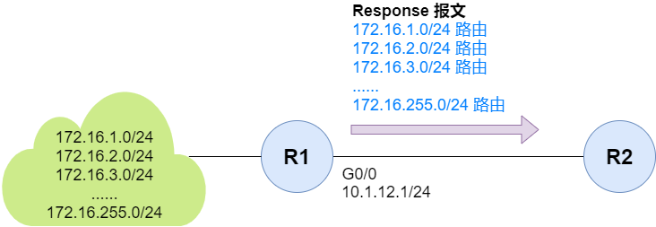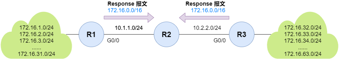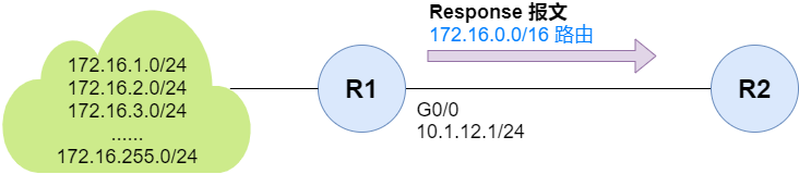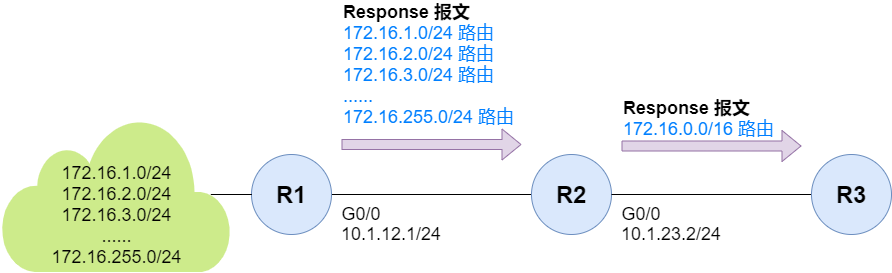 R1 连着 172.16.1.0/24 、172.16.2.0/24 和 172.16.3.0/24 等大量网段,如果 R1 将路由全部通告给 R2 ,那么 R2 的路由表会变得臃肿,而且更新路由又要占用不少带宽资源。仔细一看,发现这些网络是可以通过路由汇总进行优化的。