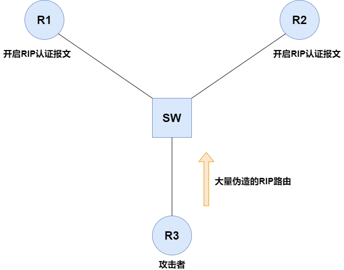 R1 和 R2 交互着 RIP 报文,现在 R3 连接到交换机上,开始在广播域泛洪 Response 报文,这些伪造的 Response 报文携带大量垃圾路由,这会造成 R1 和 R2 的路由出现混乱,或者路由表被大量垃圾路由填充,设备资源也会被大量消耗。
