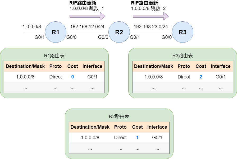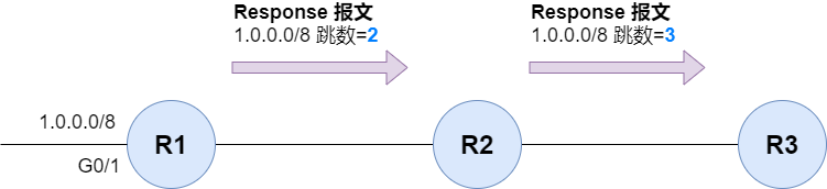 路由器运行 RIP 后,认为直连路由的跳数为 0 。R1 的直连网段 1.0.0.0/8 的度量值是 0 。R1 从 G0/0 接口通告路由时,会把 1.0.0.0/8 的度量值 +1 后通告给 R2 。R2 收到后,将 1.0.0.0/8 路由学习过来,添加到路由表中,并将度量值设置为 1 。接着 R2 将 1.0.0.0/8 路由从 G0/1 接口通告出去,R2 将路由的度量值 +1 后通告给 R3 。R3 也学习到 1.0.0.0/8 路由,度量值为 2 。