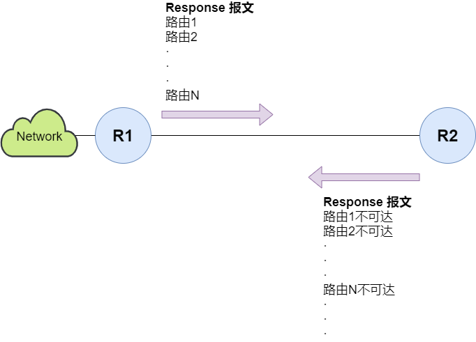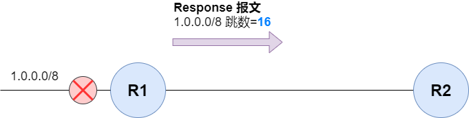 R1 的直连网段 1.0.0.0/8 变为不可达后,R1 立即发送 Response 报文通告这个更新,报文里的 1.0.0.0/8 路由度量值设置为 16 。R2 收到这个 Response 报文后,发现 1.0.0.0/8 不可达了,于是从路由表中移除这条路由。其中,R2 虽然将路由从路由表中删除,但是依然保存在 RIP 数据库中,同时启动垃圾回收计时器。