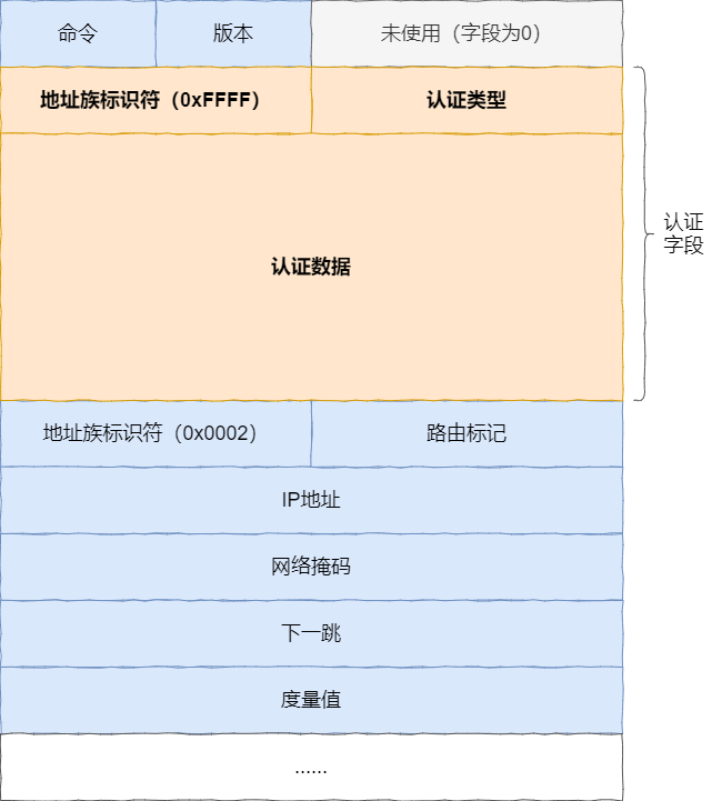 RIP 认证是基于报文的,路由器接口上配置 RIP 报文认证后,这个接口发送的 RIP 报文会携带认证信息。认证信息会占用第一个路由项,此时一个 Response 报文可携带的最大路由条目数量从 25 条变成 24 条。RIP 认证方式有: