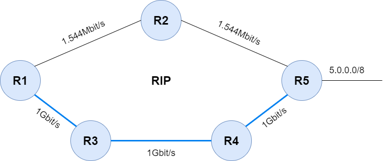 通过跳数来计算网络的路径非常简单和直观,但是也有个问题。如果网络链路带宽不一致,RIP 的路径选择可能不合理,因为 RIP 并不关注链路带宽,只关注经过的路由器个数。这种场景下,可以对 RIP 路由的度量值进行适当调整,改变数据流量的转发路径。