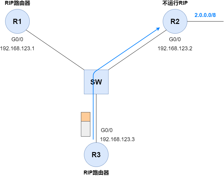 R1 、R2 和 R3 连在同一台交换机上,R1 和 R3 运行 RIPv2 ,但 R2 不支持 RIP 。R2 直连着 2.0.0.0/8 ,为了让 R1 能够访问这个网段,在 R1 上部署静态路由:ip route-static 2.0.0.0 8 192.168.123.2 。现在让 R3 也能够访问 2.0.0.0/8 ,而且希望通过 RIP 学习到这条路由,R1 将静态路由引入 RIP 。这样 R3 把路由添加到路由表,认为 R1 是下一跳。这样的话,从 R3 到 2.0.0.0/8 的数据包会先转发给 R1 ,再由 R1 转发给 R2 ,这就是次优路径。对于距离矢量路由协议而言,路由的通告者就是路由的下一跳。