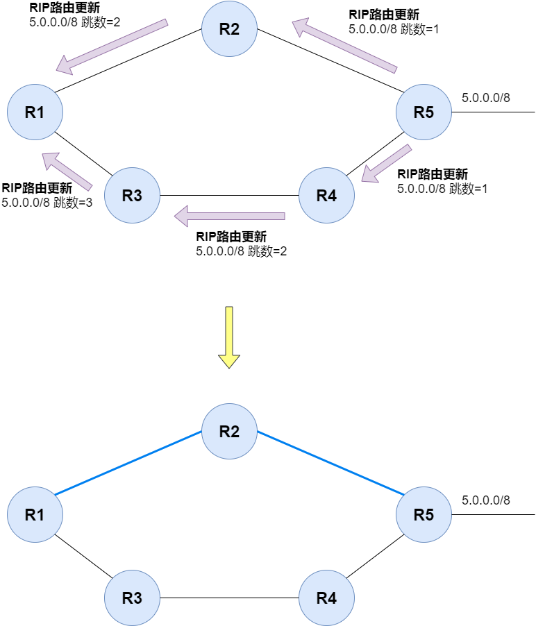 - 对于路由表中已有的路由条目,路由条目的下一跳与发送 Response 报文的路由器相同时,不论路由的度量值是增大或是减少,都更新这条路由。度量值相同时,只重置路由的老化计时器。