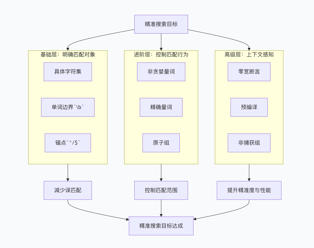 提高正则搜索精确度的核心是"缩小匹配范围、明确匹配边界、控制匹配行为",整体路径如下: