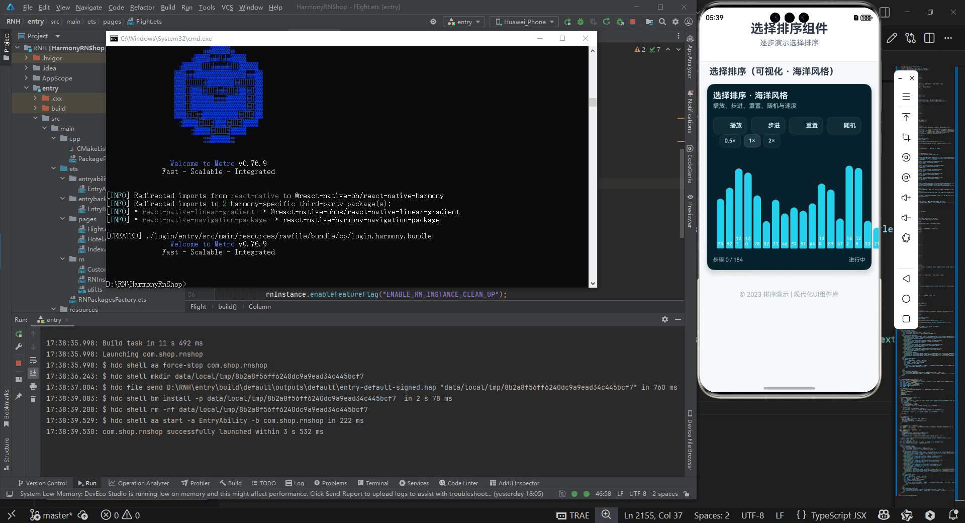 接下来通过打包命令npn run harmony将reactNative的代码打包成为bundle,这样可以进行在开源鸿蒙OpenHarmony中进行使用。