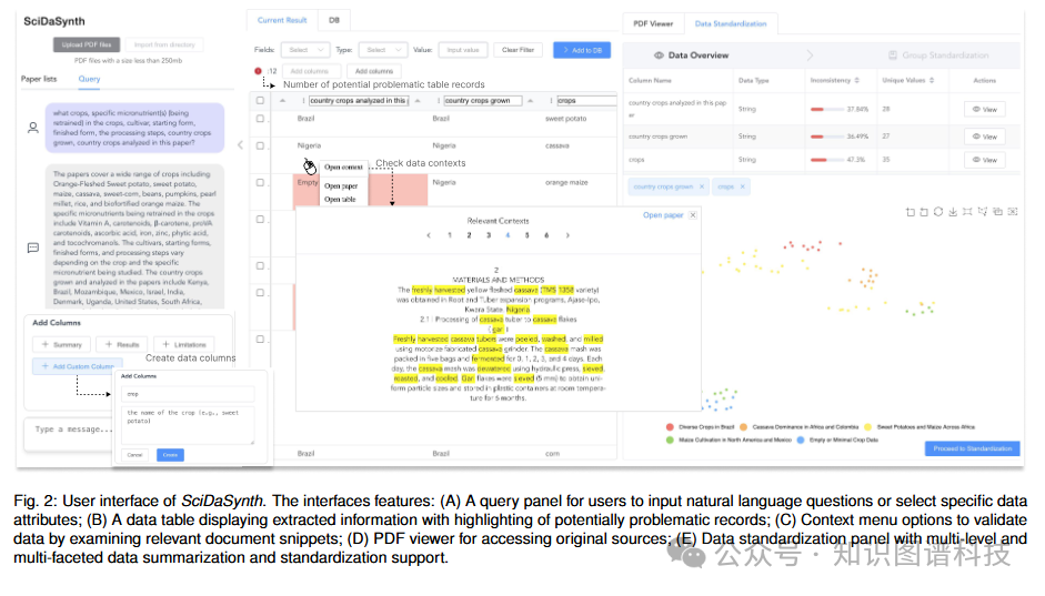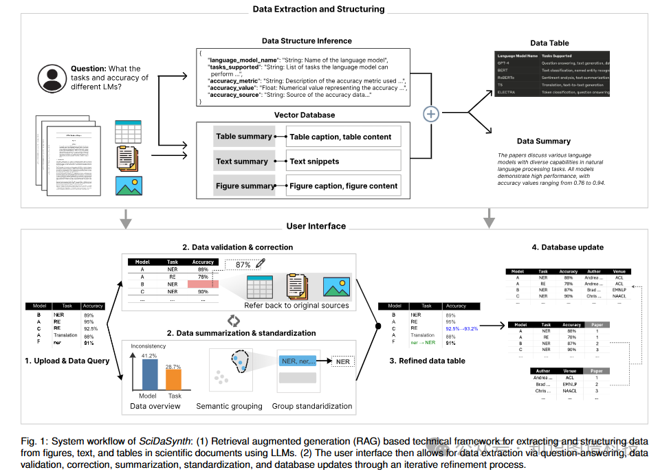 创新系统架构:SciDaSynth集成LLMs协助研究人员从广泛文献中提取和结构化多模态科学数据。系统将灵活的数据查询、多方面可视化摘要和语义分组整合在一个连贯的工作流程中,实现高效的跨文档数据验证、不一致性解决和优化。