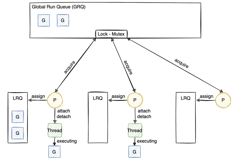 上图清晰地展示了 G-M-P 模型中 P 的核心作用:它维护 LRQ,并从 GRQ 中获取任务(需要 Lock-Mutex 保护),以及 M 如何在 P 上执行 G。