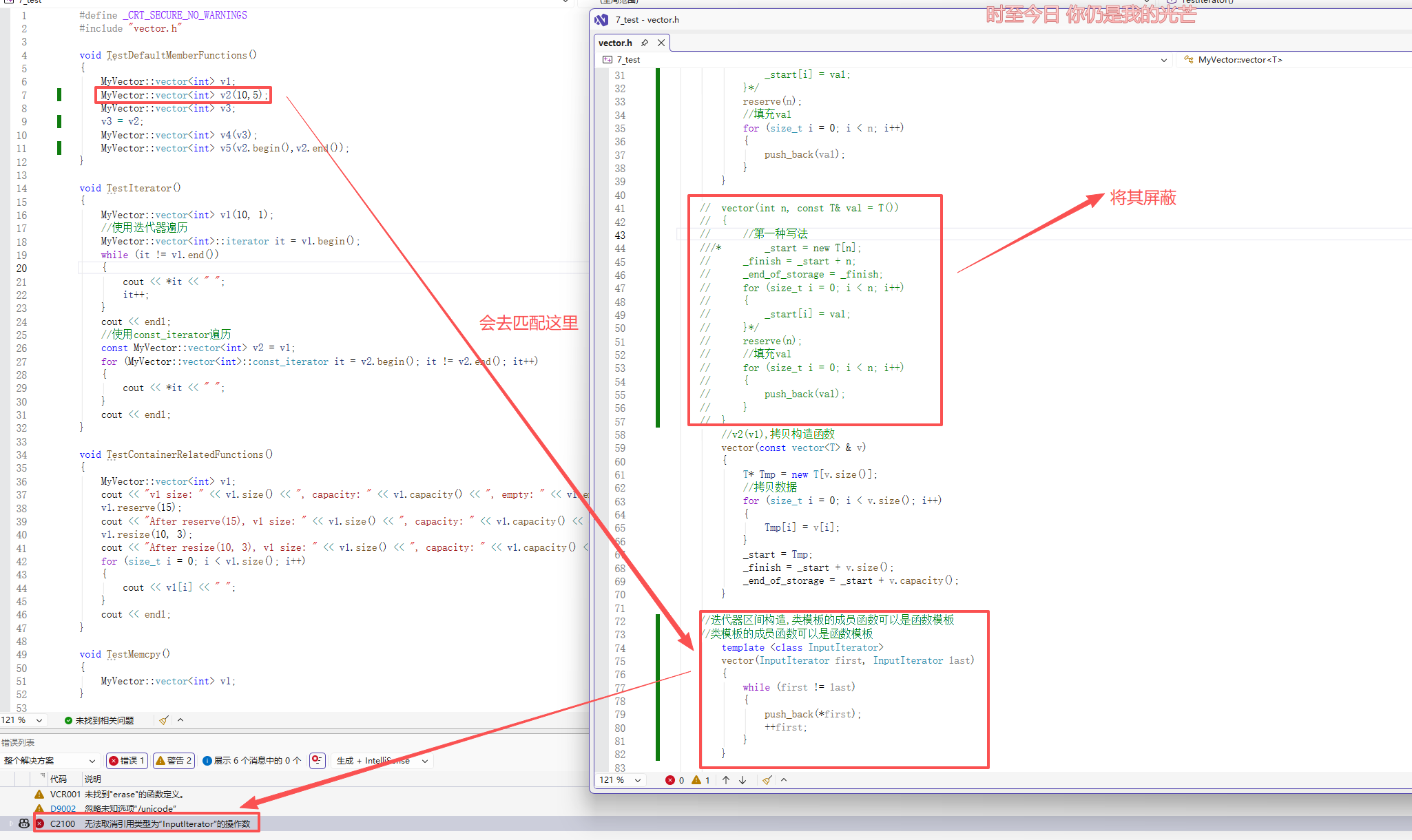 可以看到,这个重载函数与之不同的就是其参数n的类型不同,但这却是必要的,否则当我们使用以下代码时,编译器会优先与构造函数3相匹配,甚至无法通过编译