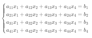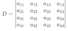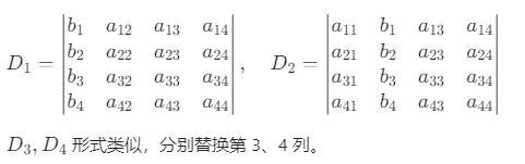 - 系数行列式:由方程组系数构成的 4 阶行列式,记为 D: