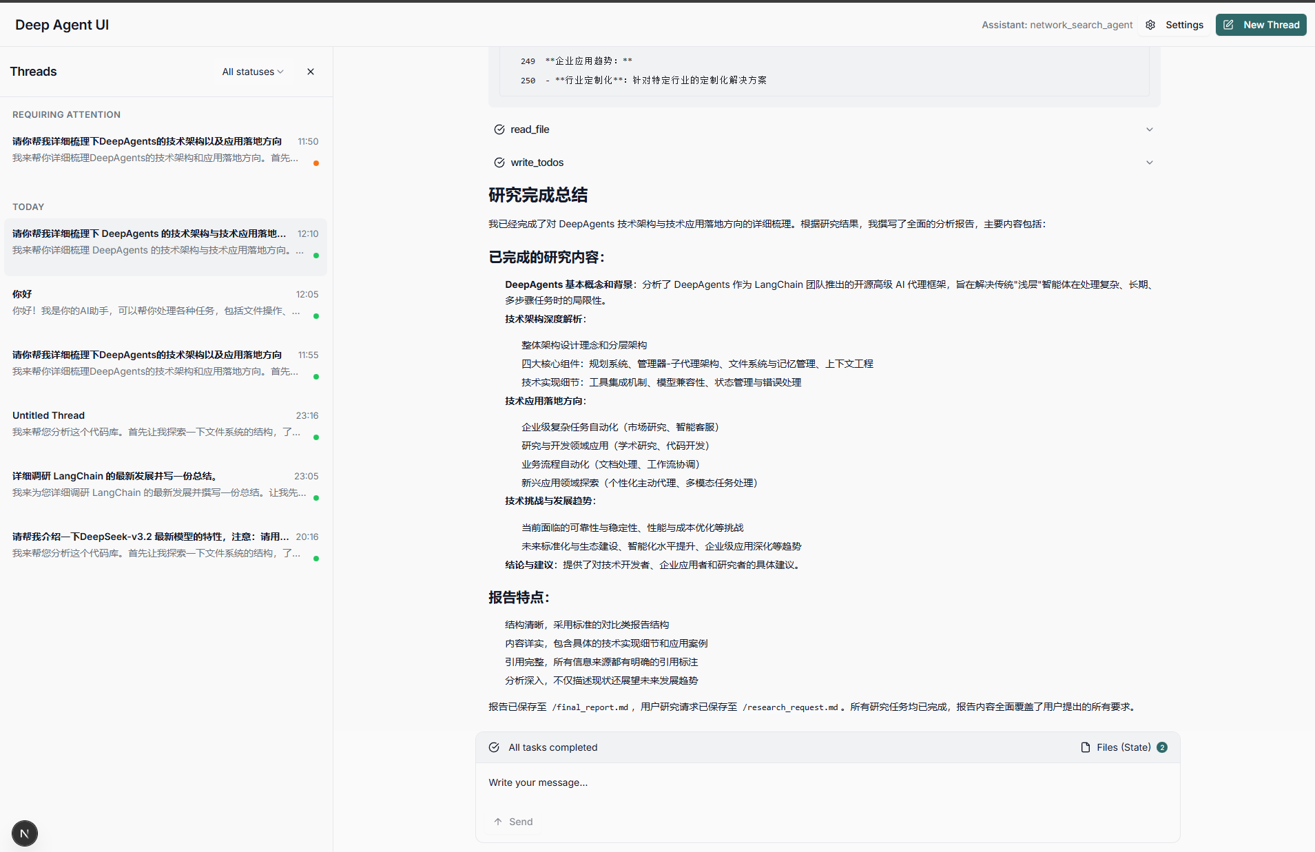 debug_agent("详细调研 LangChain DeepAgents 框架的核心特性")