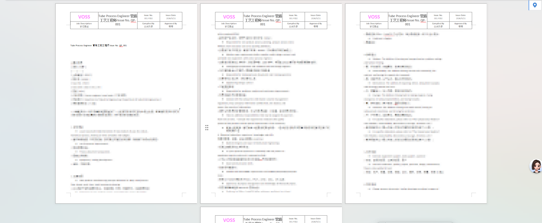 - 内容:包含标识文本(VOSS、Job Description)、职位名称、版本信息(Issue No.)、日期(Issue Date)、编制人(Compiled By)、审批人(Approved By)
