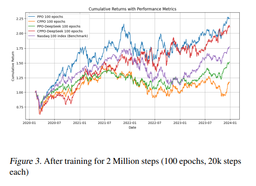 方法:在 CPPO(风险敏感版 PPO)的基础上,注入 LLM 生成的风险评估与交易建议因子,使其直接影响奖励函数与动作决策;并在 Nasdaq-100 上使用 FNSPID 新闻数据、搭配 DeepSeek V3、Qwen 2.5、Llama 3.3 进行回测验证。