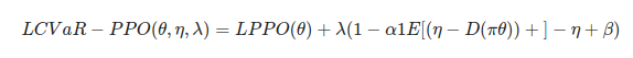D(πθ) 是轨迹回报;(η−D)+=max(0,η−D) 表示超过阈值 η 之下的亏损(即尾部损失);α 是置信水平(例如 0.05 表示最坏 5%);λ 是拉格朗日乘子(控制惩罚强度),β 为辅助惩罚项。也就是说,它在不修改 PPO 的剪切机制的同时,把"避免极端亏损"作为额外优化目标强制引入。