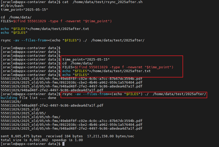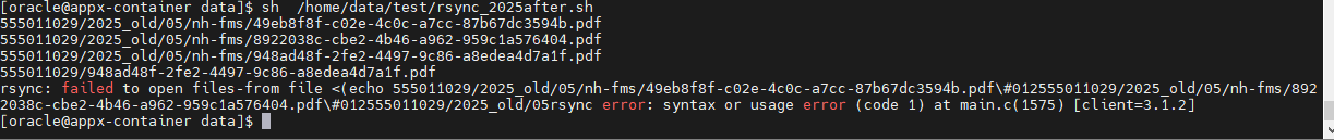 提示:rsync: failed to open files-from file <(echo 555011029/2025_old/05/nh-fms/49eb8f8f-c02e-4c0c-a7cc-87b67dc3594b.pdf\#012555011029/2025_old/05/nh-fms/8922038c-cbe2-4b46-a962-959c1a576404.pdf\#012555011029/2025_old/05