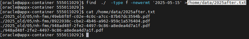 find ./ -type f -newermt '2025-05-15' >/home/data/2025after.txt