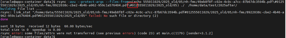 oracle@appx-container data\]$ 根据错误信息,`rsync` 在尝试读取文件列表时遇到了语法或使用错误 避免路径中#,如果路径中必须包含 `#`,可使用 `--protect-args` 选项:防止 `#` 被误认为注释符 看到上面报错中,换行符显示为 \\`#012` `printf` 不会自动转义换行符,加上 `--protect-args 貌似也不行`