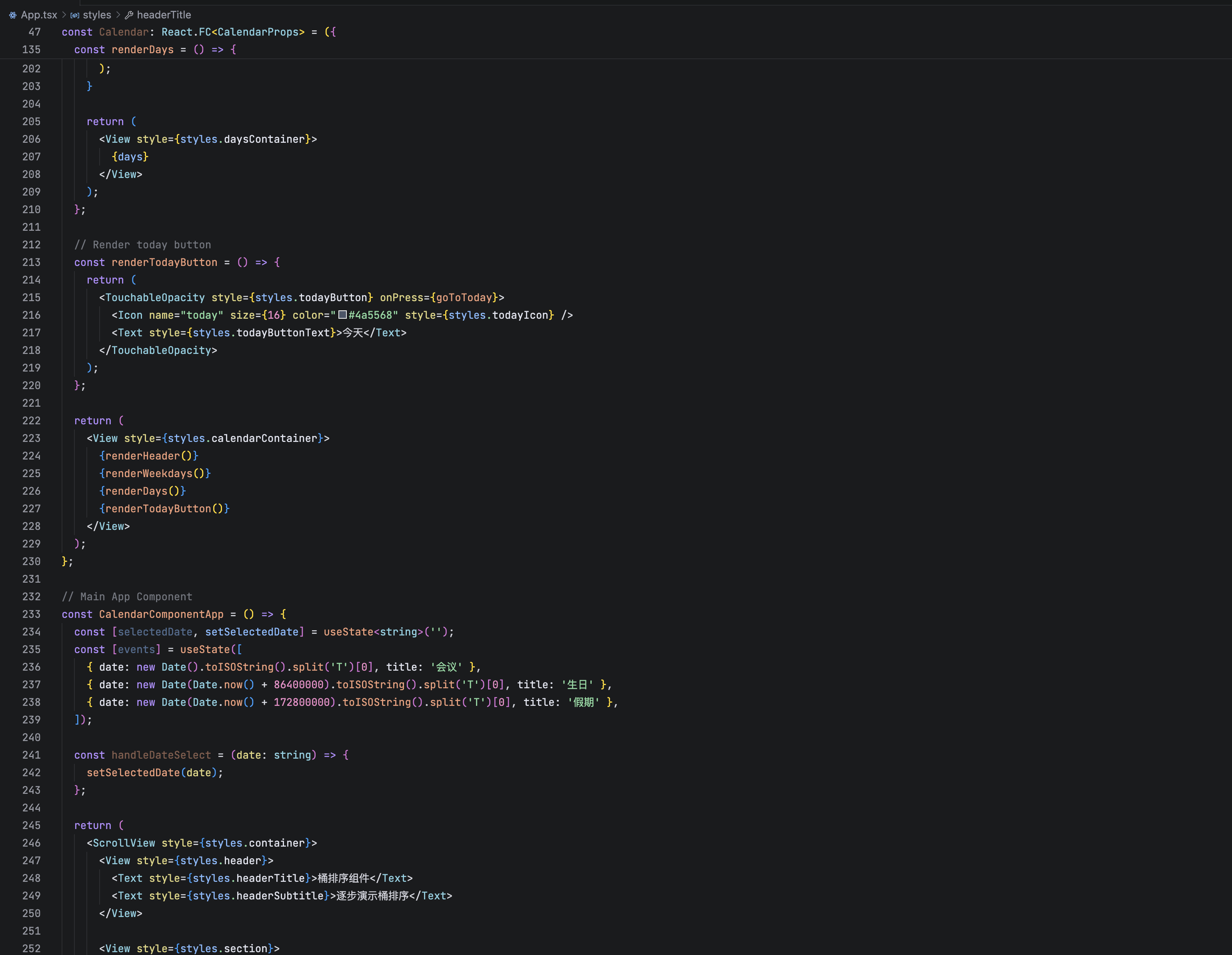 交互设计方面,TouchableOpacity组件提供了原生的触控反馈体验,这种对用户体验细节的关注与鸿蒙的人机交互设计理念完全吻合。导航按钮的点击事件处理展现了完整的用户操作响应链路,从触控输入到状态变更再到界面更新,这一完整的交互闭环与鸿蒙的分布式交互机制在原理层面高度一致。整个组件的国际化处理也展现了与鸿蒙全球化支持相一致的设计思路。月份名称通过toLocaleString方法根据系统语言自动适配,这种动态本地化机制正是鸿蒙多语言架构的核心特征。