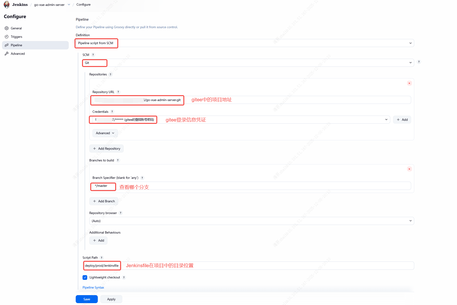点击 go-vue-admin-server 项目,进行项目配置,进入配置后,会自动适配之前在System中配置的 配置git仓库连接