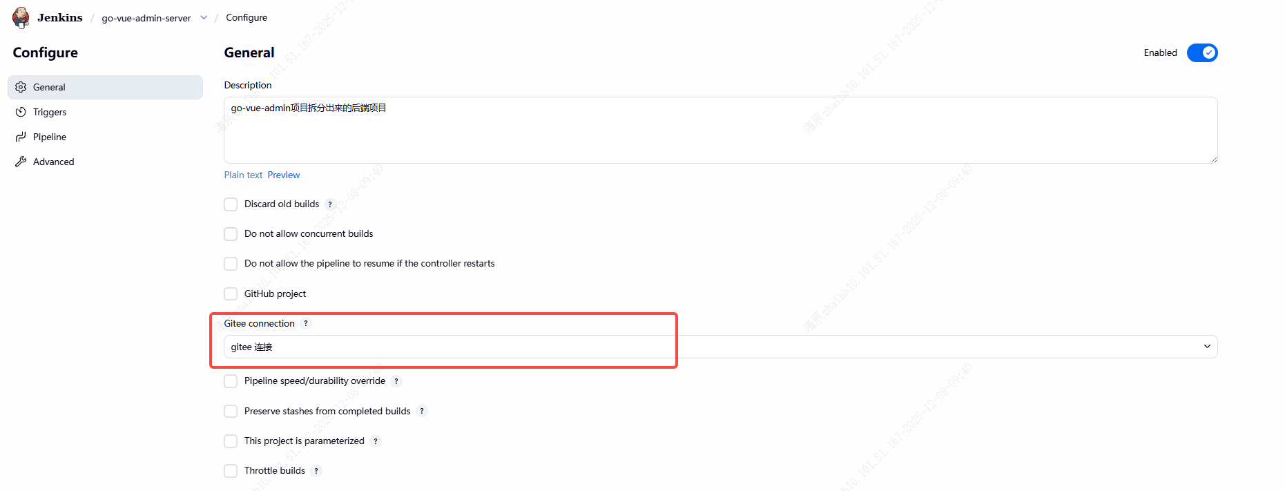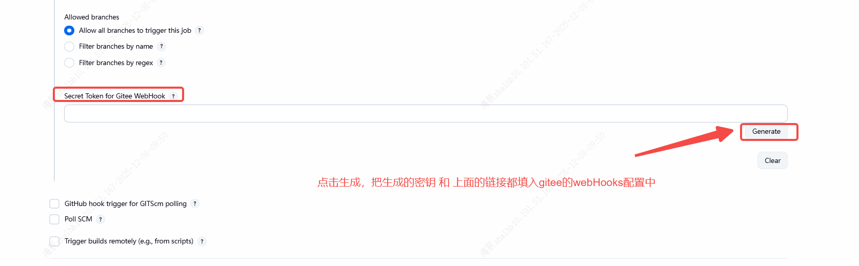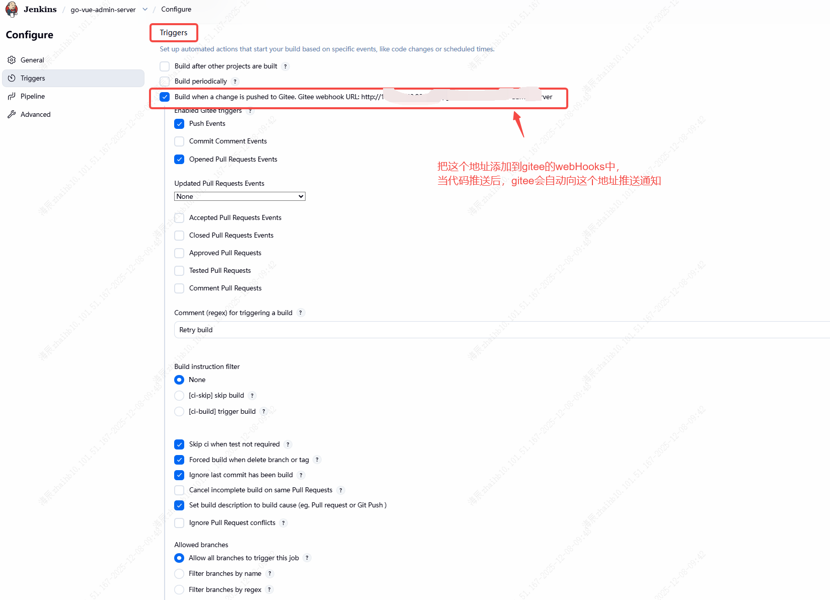 如果想要代码推送到gitee后,jenkins自动执行代码构建,则需要配置构建触发器,打通 jenkins与 gitee 的连接